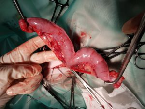 Haar baasjes hadden een afspraak ingepland voor de sterilisatie. Het teefje kwam hartstikke vrolijk binnen en het onderzoek van de dierenarts gaf ook geen bijzonderheden. Echter tijdens de operatie kwamen wij voor een verrassing te staan: de baarmoeder was ontstoken! Zie onderstaande afbeelding:
