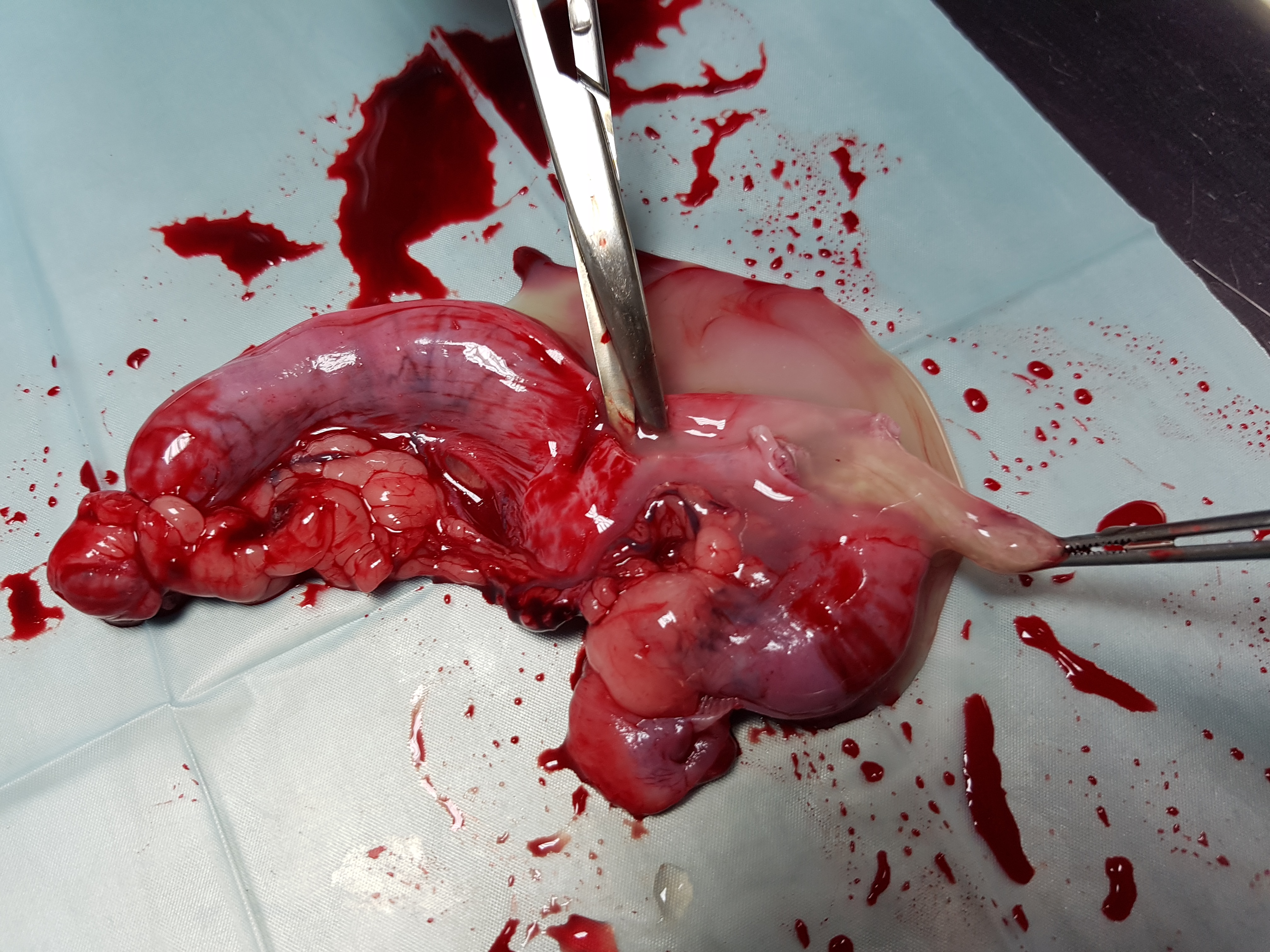 Zonder problemen hebben wij deze netjes kunnen verwijderen. Achteraf heeft de dierenarts de baarmoeder even open gesneden om te kijken of het echt ging om een ontsteking. En inderdaad: er zat veel pus in de baarmoeder. Gelukkig ging het hierbij om een gesloten ontsteking waarbij de pus niet al vanuit de baarmoeder vrij in het lichaam kon komen. Zie hieronder de opengesneden baarmoeder: